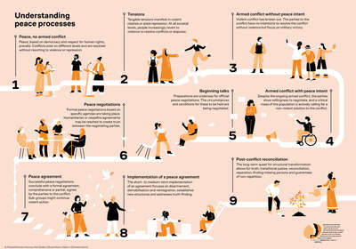 In einer graphischen Darstellung der unterschiedlichen Stadien von Friedensprozessen, rücken wir die Rolle von Frauen in den Mittelpunkt. Sie zeigt auf, wo sie Einfluss nehmen, um Friedensprozess anzutreiben und Rückschritte zu verhindern. Die Grafik ist auf Deutsch, Englisch, Spanisch und Ukrainisch verfügbar.