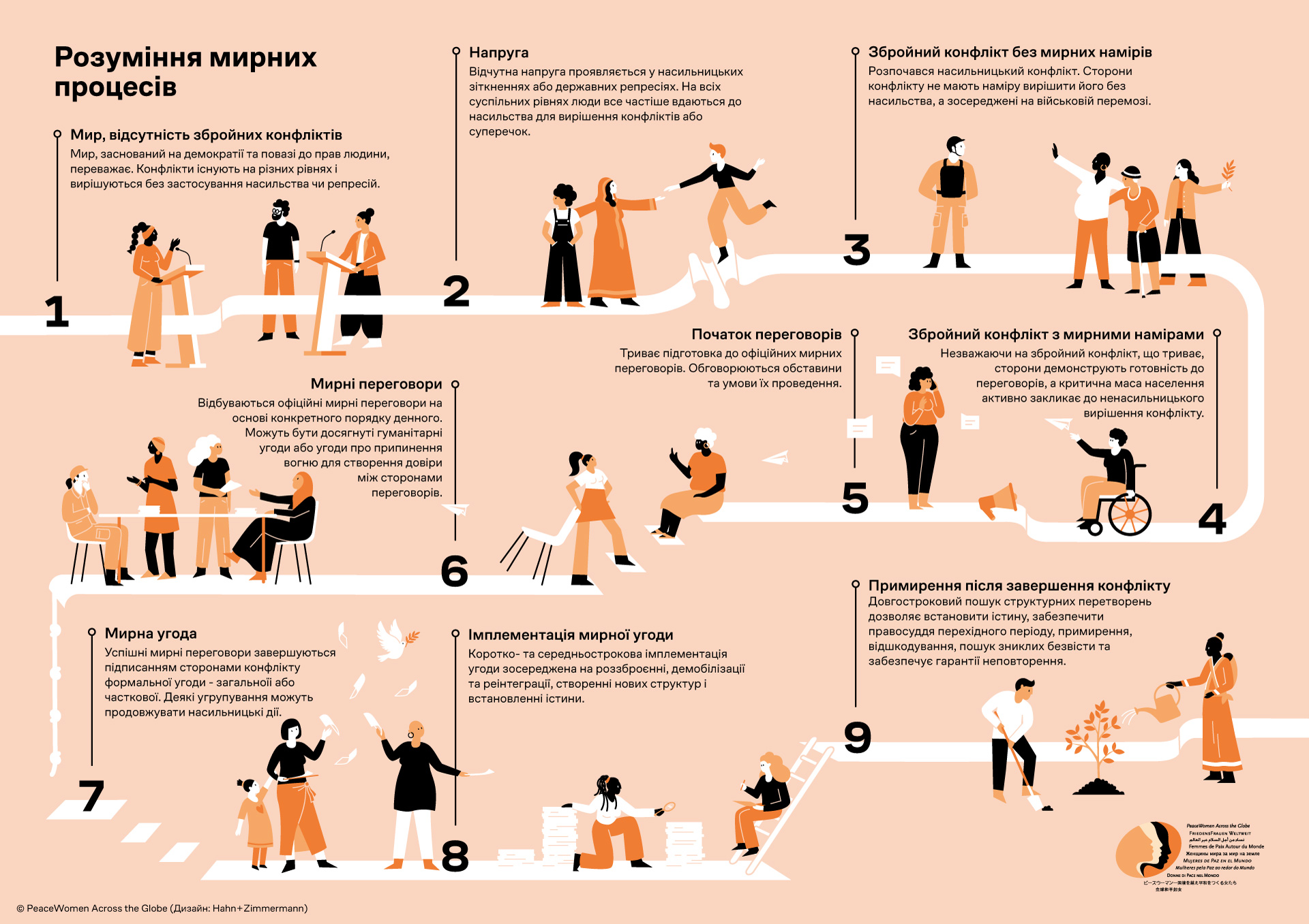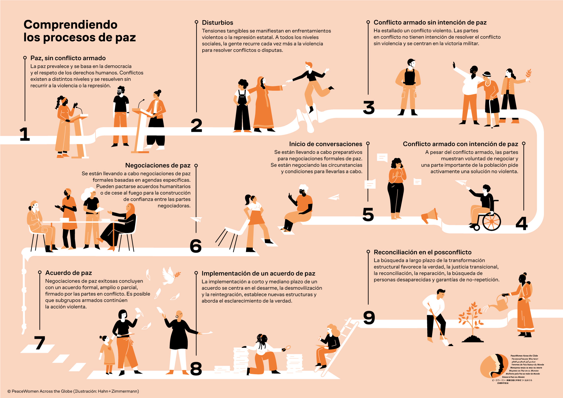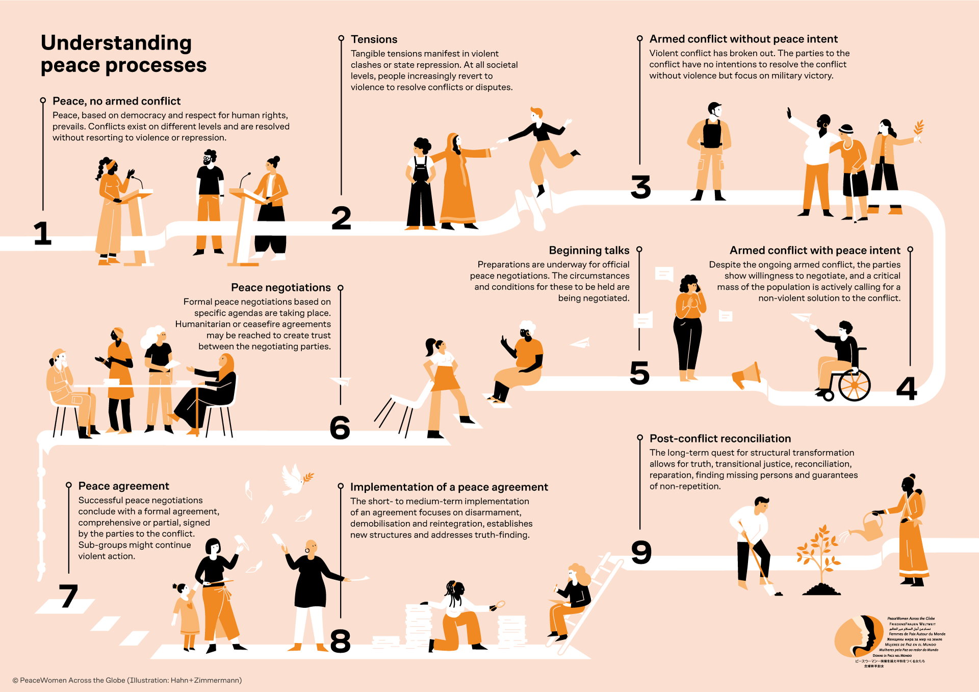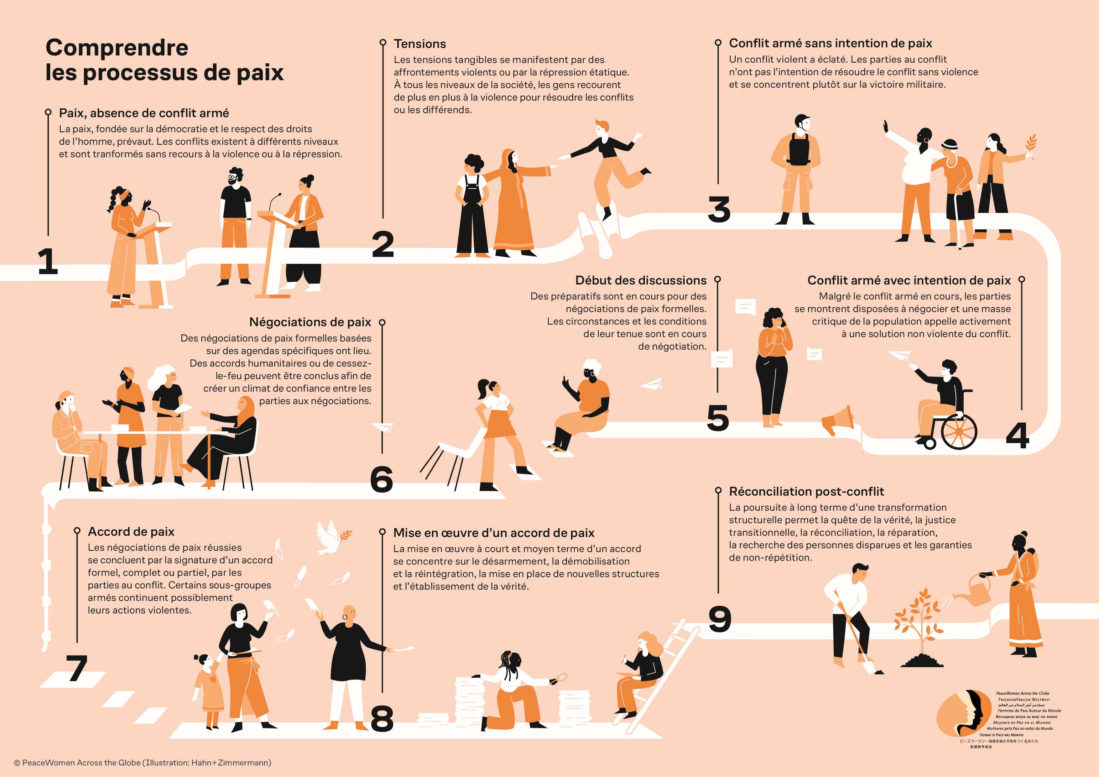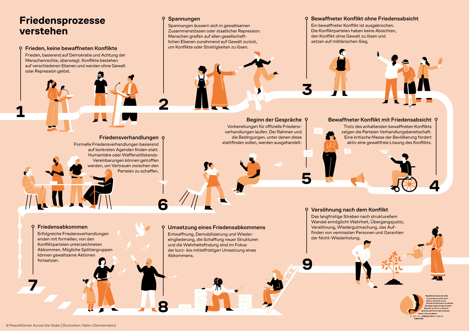 Welche Bilder löst das Wort «Friedensprozesse» bei Ihnen aus? Stellen Sie sich jahrelange Verhandlungen vor, die in einer Zeremonie münden, an der die Konfliktparteien ein Abkommen unterzeichnen, gefolgt vom Foto des Händeschlags, das um die Welt geht? Wir haben dieses gängige Bild hinterfragt und dekonstruiert und uns vertieft mit Friedensprozessen und der Frage auseinandergesetzt: «Wie beeinflussen Frauen Friedensprozesse?» Das Resultat dieser Arbeit ist eine graphische Darstellung der unterschiedlichen Stadien von Friedensprozessen. Mit diesem Instrument wollen wir in den Mittelpunkt rücken, welche Rolle Frauen spielen und wo sie Einfluss nehmen, um Friedensprozesse anzutreiben und Rückschritte zu verhindern.